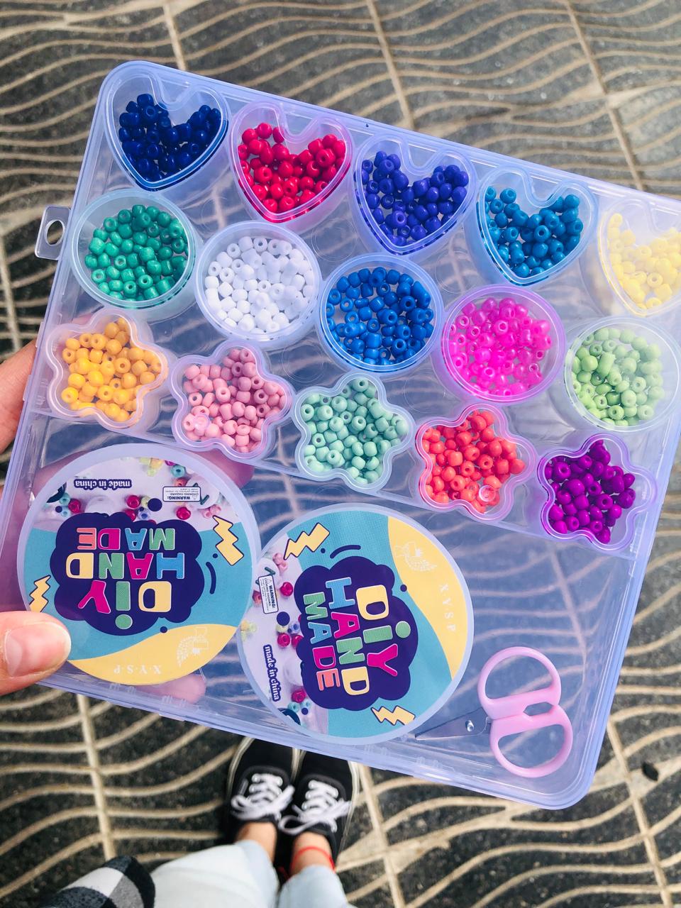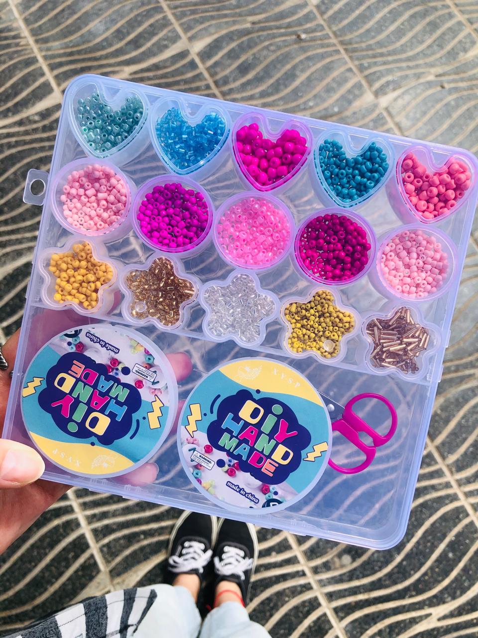 Box para armar bijou. Contiene canutillos/mostacillas de colores, tanza y tijera pequeña.