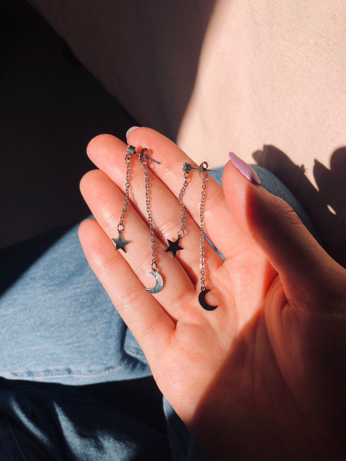 Este modelo tiene cadenitas colgando en el aro y en la tuerquita/mariposa.