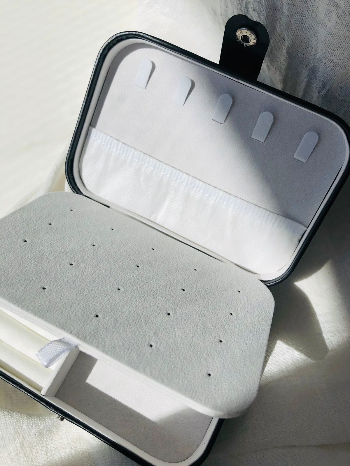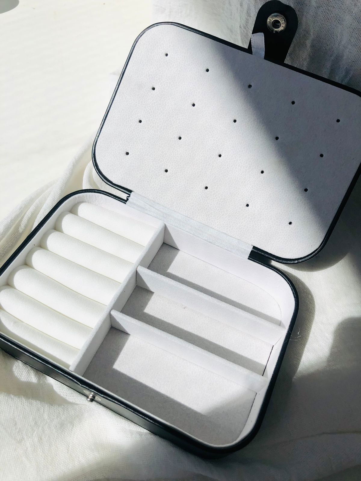 Posee espacios para acomodar anillos, cadenitas o pulseras + una solapa divisoria para aros.
